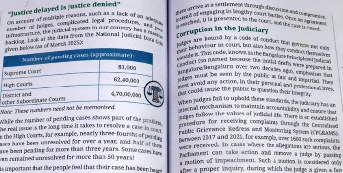 NCERT की किताबों में न्यायपालिका की कार्यप्रणाली पर टिप्पणी करते हुए यह उल्लेख किया गया था कि निचली अदालतों से लेकर उच्च स्तर तक भ्रष्टाचार की शिकायतें सामने आती रही हैं। इसके अलावा, न्यायिक फैसलों में होने वाली अत्यधिक देरी और सिस्टम की कथित अक्षम कार्यप्रणाली को लेकर भी आलोचनात्मक पैराग्राफ शामिल किए गए थे। शिक्षा मंत्रालय और NCERT से जुड़े विशेषज्ञों का मानना है कि स्कूली स्तर के छात्रों के लिए यह सामग्री असंतुलित है और इससे संवैधानिक संस्थाओं को लेकर नकारात्मक धारणा बन सकती है।