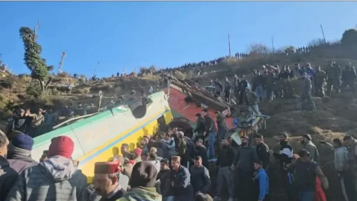 हिमाचल प्रदेश के सिरमौर जिले में रविवार को एक दर्दनाक सड़क हादसा हो गया। श्री रेणुकाजी विधानसभा क्षेत्र के हरिपुरधार इलाके में एक प्राइवेट बस अनियंत्रित होकर करीब 400 मीटर गहरी खाई में गिर गई। इस हादसे में अब तक 13 लोगों के मारे जाने की सूचना है, जबकि एक दर्जन से अधिक लोग घायल बताए जा रहे हैं। मृतकों की संख्या बढ़ने की आशंका जताई जा रही है।